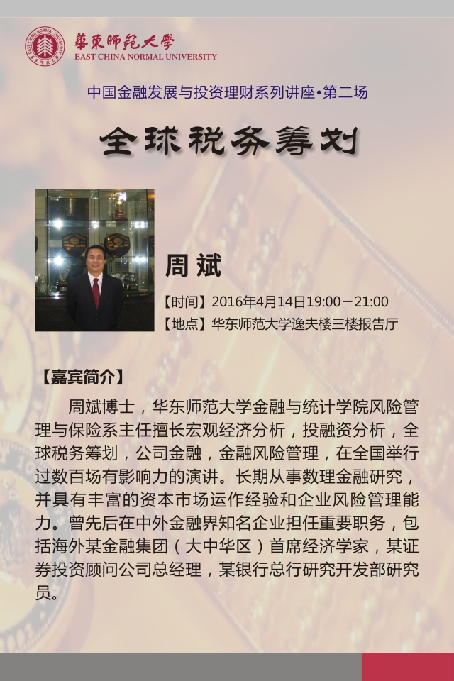 周斌博士,华东师范大学金融与统计学院风险管理与保险系主任擅长宏观经济分析,投融资分析,全球税务筹划,公司金融,金融风险管理,,在全国举行过数百场有影响力的演讲。长期从事数理金融研究,并具有丰富的资本市场运作经验和企业风险管理能力。曾先后在中外金融界知名企业担任重要职务,包括海外某金融集团(大中华区)首席经济学家,某证券投资顾问公司总经理,某银行总行研究开发部研究员。