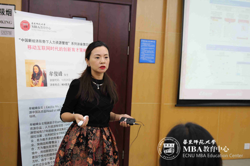 10月29日晚,华东师范大学MBA“中国新经济形势下人力资源管理”系列讲座第四场在中心301报告厅举行,资深人力资源总监、华东师范大学MBA兼职导师牟峻峰女士为学员们带来一场主题为“移动互联网时代的创新育才策略”的精彩讲座。众多学员前来聆听,并与牟女士现场互动,在智慧的碰撞中获得启发。牟峻峰女士现就职于Etam法国艾格集团,担任中国区人力资源总监...