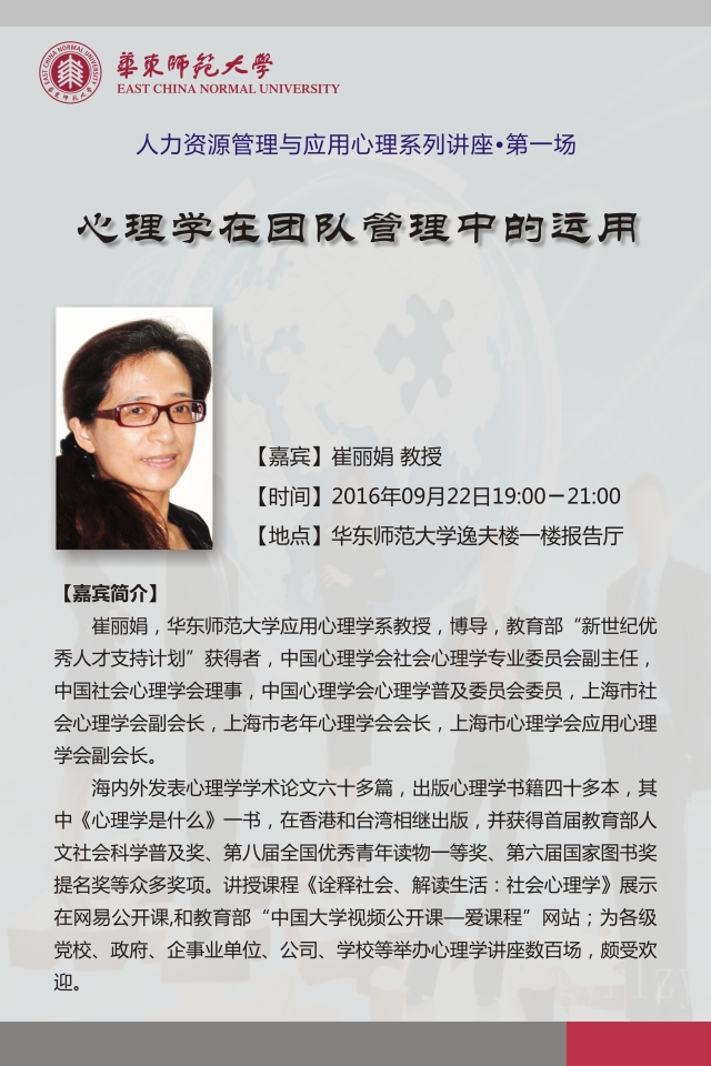 崔丽娟,华东师范大学应用心理学系教授,博导,教育部“新世纪优秀人才支持计划”获得者,中国心理学会社会心理学专业委员会副主任,中国社会心理学会理事,中国心理学会心理学普及委员会委员,上海市社会心理学会副会长,上海市老年心理学会会长,上海市心理学会应用心理学会副会长。