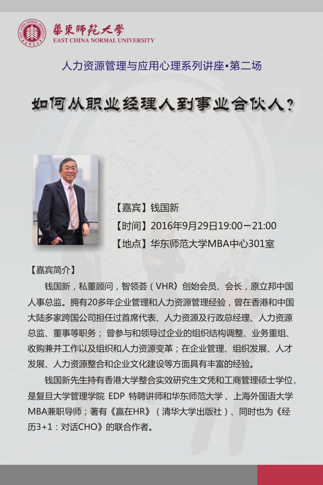钱国新先生持有香港大学整合实效研究生文凭和工商管理硕士学位,是复旦大学管理学院EDP特聘讲师和华东师范大学、上海外国语大学MBA兼职导师;著有《赢在HR》(清华大学出版社)、同时也为《经历3+1:对话CHO》的联合作者。