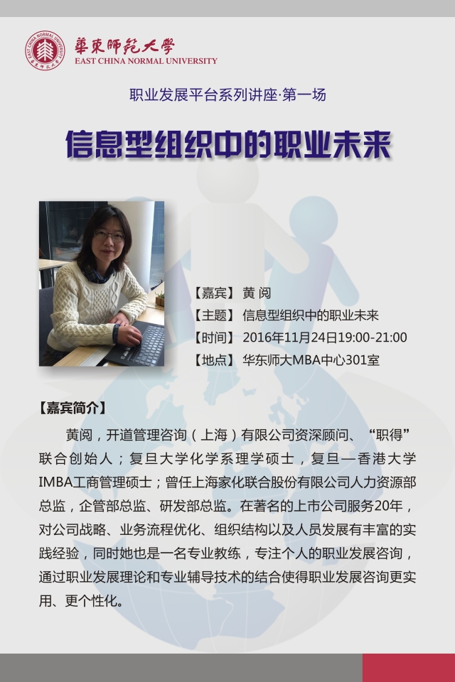 黄阅,开道管理咨询(上海)有限公司资深顾问、“职得”联合创始人;复旦大学化学系理学硕士,另完成了复旦--香港大学 IMBA 学业,获得工商管理硕士的学位;曾任曾任上海家化联合股份有限公司人力资源部总监,企管部总监、研发部总监;在著名的上市公司服务20年,对公司战略、业务流程优化、组织结构以及人员发展有丰富的实践经验,同时她也是一名专业教练,专注个人的职业发展咨询,通过职业发展理论和专业辅导技术的结合使得职业发展咨询更实用、更个性化。