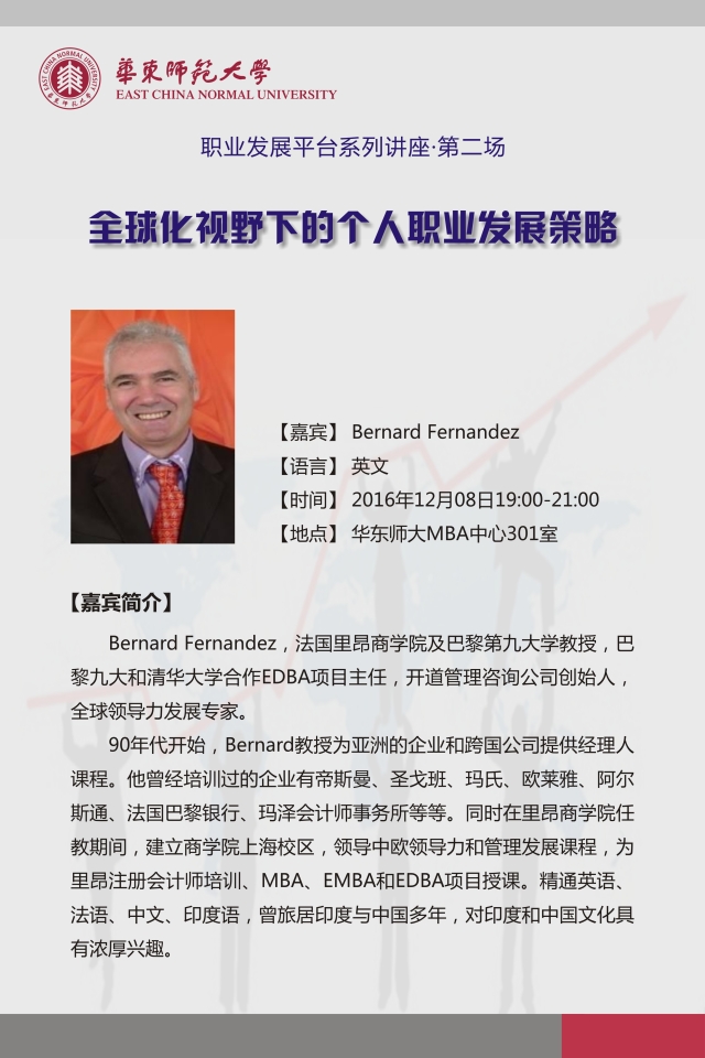 Bernard Fernandez,法国里昂商学院及巴黎第九大学教授,巴黎九大和清华大学合作EDBA项目主任,开道管理咨询公司创始人,全球领导力发展专家。