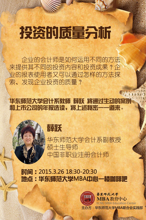 主题:投资的质量分析 时间:2015年3月26日 18:30-20:30 地点:华东师范大学MBA中心一楼咖啡吧