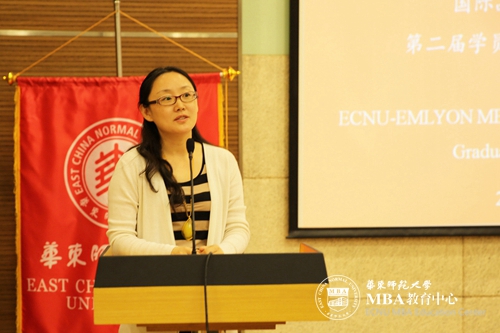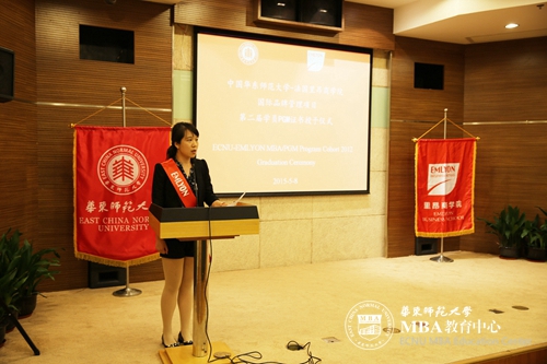 项目学员骆奕文作为毕业生代表上台发言,首先她感谢华东师范大学和里昂商学院所有为项目付出的老师,回忆了两年半中与同学一起度过的难忘时光,分享了将所学MBA知识运用到企业管理实际中去的经验,分享了攻读华东师范大学MBA、参与国际品牌管理项目而获得职业提升。她表示,同学们将一如既往地关心和支持母校,为母校的发展多做贡献。