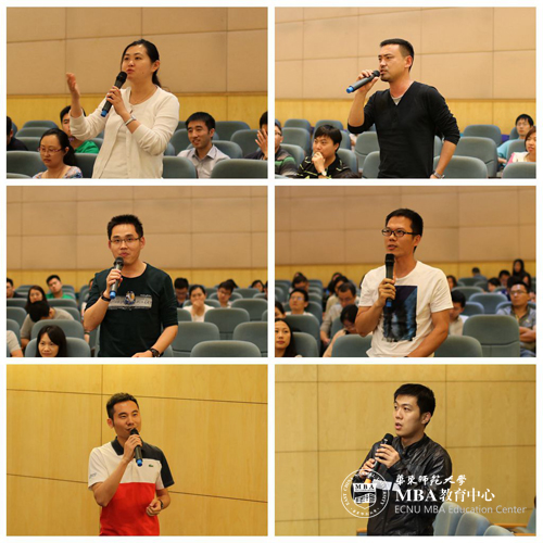 在随后进行的校友专题分享环节,中心特别邀请季姚力、陈宇、杨波、蒋瑶、宋东毅和杜英杰六位校友,以学长学姐的身份,和新生进行心的沟通,他们分别从MBA课程学习、案例大赛参赛经验、高级管理行动参与体验、MBA学生活动和MBA创业几个方面,谈自己的亲身经历,分享自己的体会和感悟,传授新生经验与教训,他们的专题分享引起新生深厚的兴趣,在他们分享之后进行了长时间的问答环节。许多新生表示,通过与学长学姐的交流,对未来的MBA学习更加充满了期待,也更加明确了自己的目标。